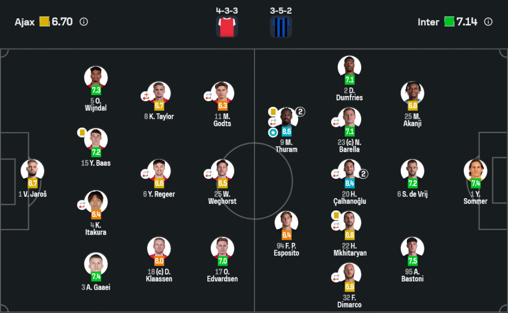 การ วิเคราะห์บอล เกมนี้เห็นชัดว่าอาแจกซ์เน้นการครองบอลและการต่อบอลสั้น แต่ขาดทีเด็ดในพื้นที่สุดท้าย ยิงเข้ากรอบเพียง 2 ครั้ง ขณะที่อินเตอร์เล่นเกมรับเหนียวแน่นแล้วสวนกลับสุดอันตราย ใช้ความเร็วและความคมของธูรามเล่นงานแนวรับเจ้าถิ่น การจับคู่กับชัลฮาโนกลูถือว่าสมบูรณ์แบบจนสร้างสองประตูสำคัญ