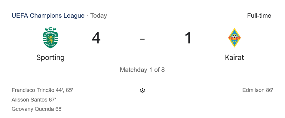 บ้านผลบอล สรุปหลังเกม ยูฟ่าแชมเปี้ยนส์ลีกระอุ! สปอร์ติง ลิสบอน ฟอร์มดุดัน ฟรานซิสโก ตรินเกา เบิ้ลพาทีมถล่ม ไครัต 4-1 ลั่นประกาศศักดาเกมแรก