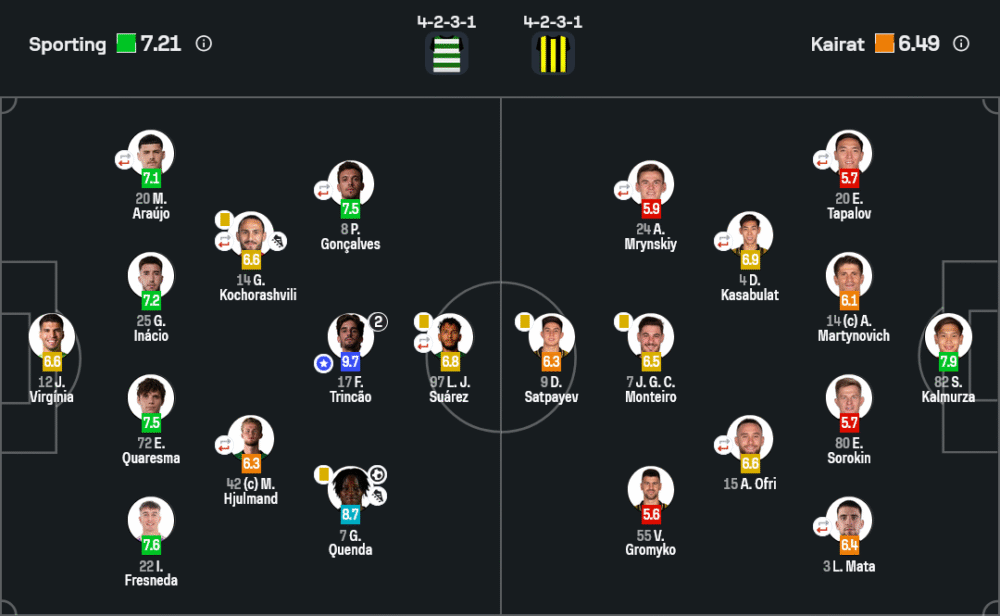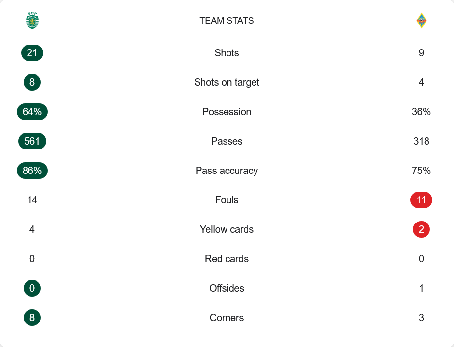 แม้ไครัตจะครองบอลเพียง 36% แต่ก็พยายามยิงได้ 9 ครั้ง ทว่าเปลี่ยนเป็นประตูได้เพียง 1 ขณะที่สปอร์ติงครองบอลถึง 64% สร้างโอกาสยิง 21 ครั้ง เข้ากรอบ 8 หน และกดไปถึง 4 ประตู การจ่ายบอลของเจ้าถิ่นสูงถึง 561 ครั้ง ความแม่นยำ 86% แสดงถึงมาตรฐานระดับสูง แตกต่างจากไครัตที่จ่ายเพียง 318 ครั้ง ความแม่นยำแค่ 75% เกมนี้จึงสะท้อนคุณภาพทีมและแท็กติกชัดเจน