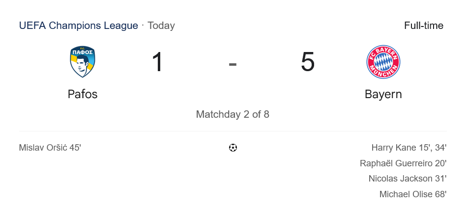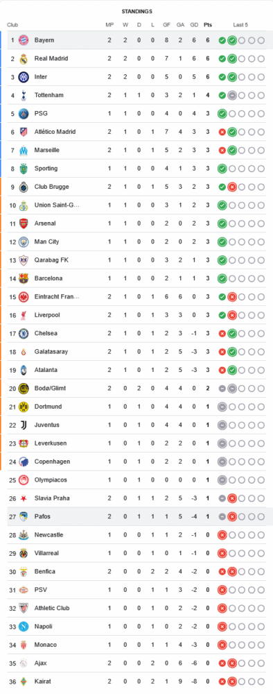 หลังจบเกมนี้ บาเยิร์น มิวนิค เก็บเพิ่มเป็น 6 คะแนนเต็มจาก 2 นัด นำเป็น จ่าฝูงกลุ่ม ด้วยประตูได้เสีย +8 ขณะที่ ปาฟอส แพ้สองนัดรวด อยู่ท้ายตาราง (-4) ต้องเร่งฟอร์มหากหวังเข้ารอบ