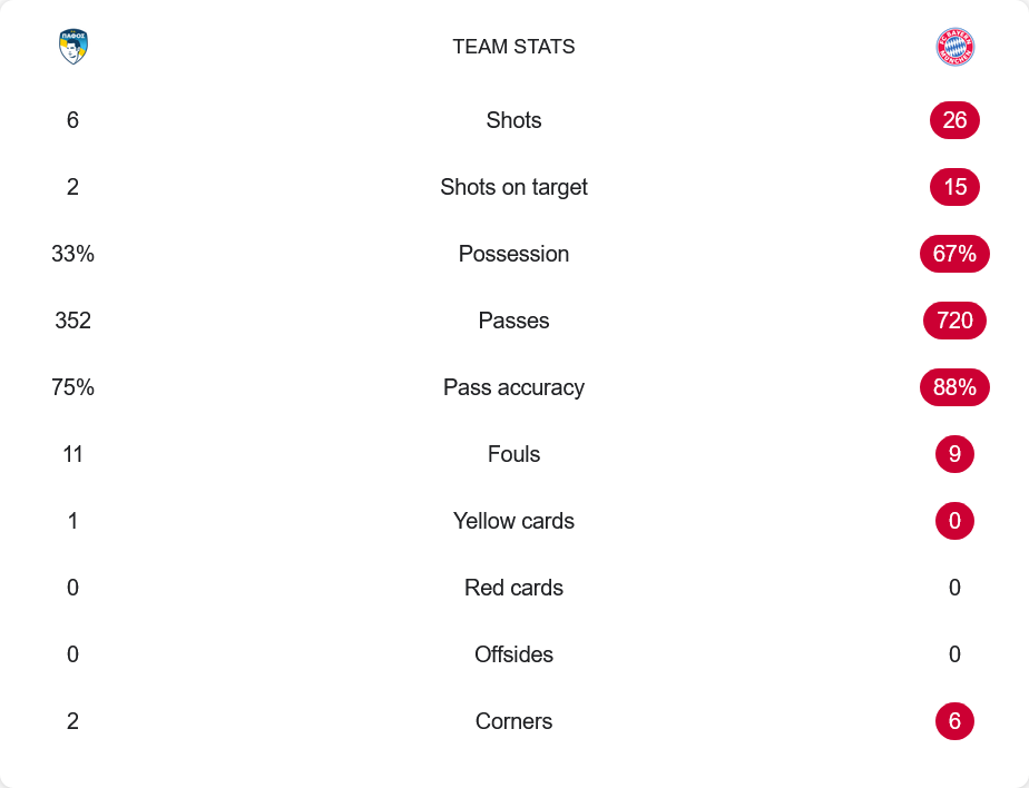 รูปเกมชัดเจนว่า บาเยิร์น ครองบอลเหนือกว่าอย่างสิ้นเชิงด้วยสัดส่วน 67% และเน้นการเข้าทำจากแดนกลางและริมเส้น โดยมี คิมมิช คอยคุมจังหวะ โอลิเซ่ และ ดิอาซ เติมริมเส้นสร้างโอกาสถึง 15 ครั้ง จนทำให้แนวรุกที่นำโดย เคน และ แจ็คสัน มีพื้นที่เข้าทำอย่างต่อเนื่อง