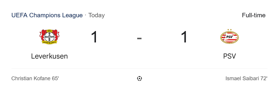 บ้านกีฬาเกาะติด ผลบอลสด ยูฟ่า แชมเปียนส์ลีก จากถ้ำไบอารีน่า เกมเดือดของกลุ่มนี้ลงเอยด้วยการแบ่งแต้ม ไบเออร์ เลเวอร์คูเซิน เสมอ พีเอสวี ไอนด์โฮเฟ่น 1-1 เจ้าถิ่นขึ้นนำก่อนจาก คริสเตียน โกฟาเน่ นาที 65 แต่พีเอสวีไม่ยอมแพ้ อิสมาเอล ไซบารี ยิงตีเสมอ นาที 72 กอดคอรับหนึ่งแต้มแบบลมหายใจหายใจรดต้นคอ