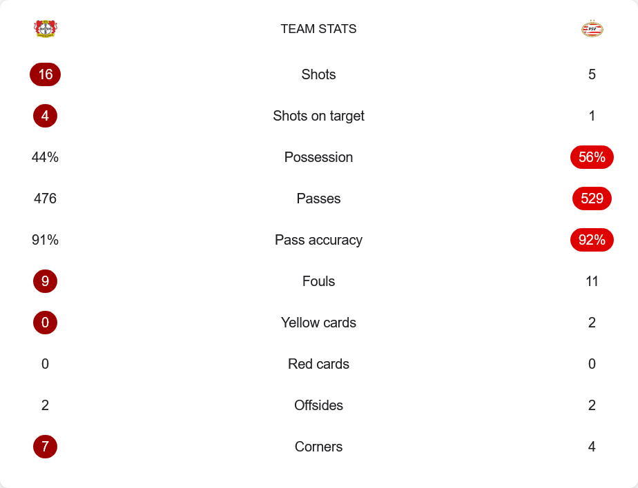 ภาพรวมสะท้อนสไตล์ชัดเจน เลเวอร์คูเซินสร้างโอกาสมากกว่า ยิงรวม 16 ครั้ง เข้ากรอบ 4 ได้เตะมุม 7 ครั้ง บ่งบอกการกดพื้นที่หน้าเขตโทษของพีเอสวี ส่วนทีมเยือนครองบอลมากกว่าราว 56% ต่อบอล 529 ครั้ง ความแม่นยำ 92% แต่จบเพียง 5 ครั้ง เข้ากรอบ 1 หน ฟาวล์ใกล้เคียงกัน (เจ้าบ้าน 9/ทีมเยือน 11) ใบเหลืองเป็นของพีเอสวี 2 ใบ เกมไร้ใบแดงและออฟไซด์แทบไม่เกิด