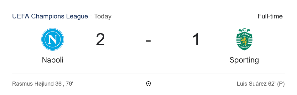 นาโปลีเก็บชัยแรกในรอบแบ่งกลุ่ม มี 3 คะแนนจาก 2 นัด ยังมีโอกาสลุ้นเข้ารอบเต็มตัว ส่วนสปอร์ติ้ง ลิสบอน มี 3 คะแนนเช่นกันจาก 2 นัด ผลต่างประตูยังคงดี (+3) แต่ต้องระวังหากสะดุดเพิ่มในเกมต่อไปเพราะสถานการณ์กลุ่มยังสูสี