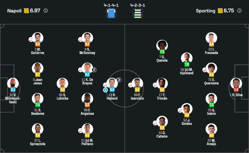 ราสมุส ฮอยลุนด์ (8.6) — กองหน้าที่สร้างความแตกต่าง เหมาคนเดียวสองลูก สร้างความกดดันแนวรับคู่แข่งตลอดทั้งเกม และคือจุดชี้ขาดชัยชนะของนาโปลี