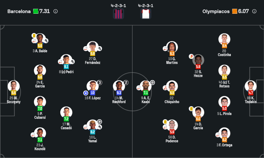 เฟร์มิน โลเปซ (เรตติ้ง 10 เต็ม) มิดฟิลด์หนุ่มยึดพื้นที่ระหว่างไลน์รับ–กลางของโอลิมเปียกอสได้เนียนกริบ การสอดไปรับบอลช่องครึ่ง spaces และการจบสกอร์เฉียบทั้งสามลูก ทำให้เกมนี้ไหลตามเขาแทบทั้งหมด เป็นหัวใจการเชื่อมระหว่างเพดรี–แรชฟอร์ด–ยามาล จนแนวรับคู่แข่งแตกกระเจิง