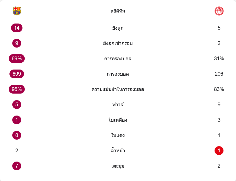เกมนี้ตัวเลขข่มชัดเจน บาร์เซโลน่ายิง 14 ครั้ง เข้ากรอบ 9 ครองบอล 69% จ่ายบอล 609 ครั้ง ความแม่นยำสูงถึง 95% โอลิมเปียกอสยิง 5 เข้ากรอบ 2 ครองบอล 31% จ่าย 206 ครั้ง ความแม่นยำ 83% ฝั่งทีมเยือนฟาวล์มากกว่า 9 ต่อ 5 ใบเหลือง 3 ต่อ 1 และมีใบแดง 1 ใบ ทำให้ช่วงท้ายครึ่งหลังรับมือแรงกดดันไม่ไหว เตะมุมบาร์ซ่า 7 ต่อ 2 แสดงภาพการบุกอย่างต่อเนื่องริมเส้น