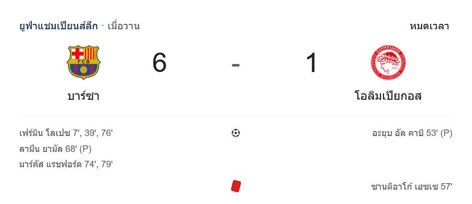 จาก : ผลบอลสด ยูฟ่าแชมเปียนส์ลีก ระหว่าง บาร์เซโลน่า 6-1 โอลิมเปียกอส ไพรีอัส วันนี้ 21/10/68 – บ้านกีฬา