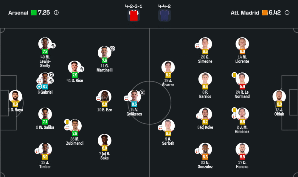 เกมนี้ชัดเจนว่า อาร์เซนอล เดินเกมด้วยความมั่นใจในระบบ 4-2-3-1 ที่ช่วยให้ทีมครองบอลได้มากกว่า คุมแดนกลางและจังหวะรุกได้ดีกว่าอย่างเห็นได้ชัด การบุกของ “ปืนใหญ่” เน้นการเปิดพื้นที่ริมเส้นและการประสานงานเร็วระหว่าง ไรซ์, มาร์ติเนลลี และ ยอเกเรส ซึ่งช่วยฉีกแนวรับของแอตฯ มาดริดได้ตลอด