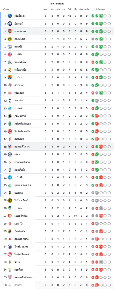 ชัยชนะในเกมนี้ส่ง อาร์เซนอล ขยับขึ้นไปรั้งอันดับ 3 ของตาราง มี 9 คะแนนจาก 3 นัด เท่ากับจ่าฝูงอย่างเปแอสเชและอินเตอร์ แต่อยู่รองด้วยลูกได้เสีย ส่วน แอตเลติโก มาดริด สถานการณ์เริ่มน่าห่วง รั้งอันดับ 18 มีเพียง 0 คะแนนจาก 3 นัด โอกาสเข้ารอบน็อกเอาต์ริบหรี่ลงเรื่อยๆ