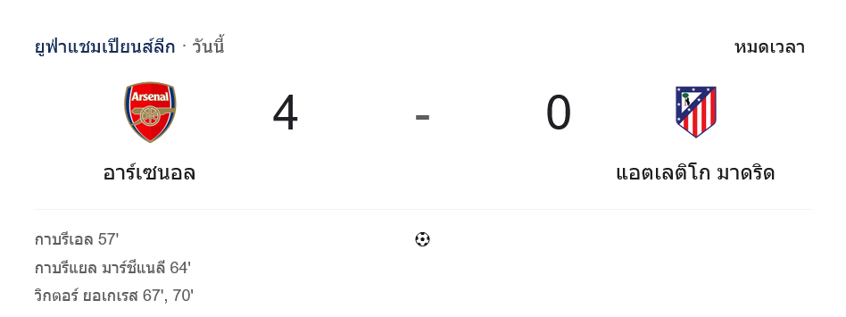 เกมมาเปลี่ยนในครึ่งหลัง นาที 57 กาเบรียล มากัลเญส โขกประตูแรกให้เจ้าบ้านขึ้นนำ 1-0 สร้างความมั่นใจและเสียงเชียร์ลั่นสนามเอมิเรตส์ นาที 64 กาเบรียล มาร์ติเนลลี บวกเม็ดสองจากการประสานงานสุดเนียน ก่อนที่ วิคตอร์ ยอเกเรส จะซัดเบิ้ลในนาที 67 และ 70 ปิดเกมแบบสุดมันส์ จบ 90 นาที อาร์เซนอล ยำใหญ่ แอตฯ มาดริด 4-0