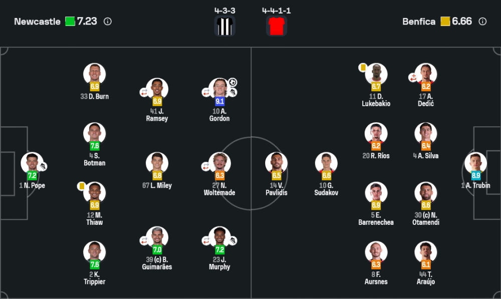 ผู้เล่นตัวจริง: Pope (GK), Trippier, Thiaw, Botman, Burn, Guimarães, Miley, Woltemade, Murphy, Gordon, Ramsey