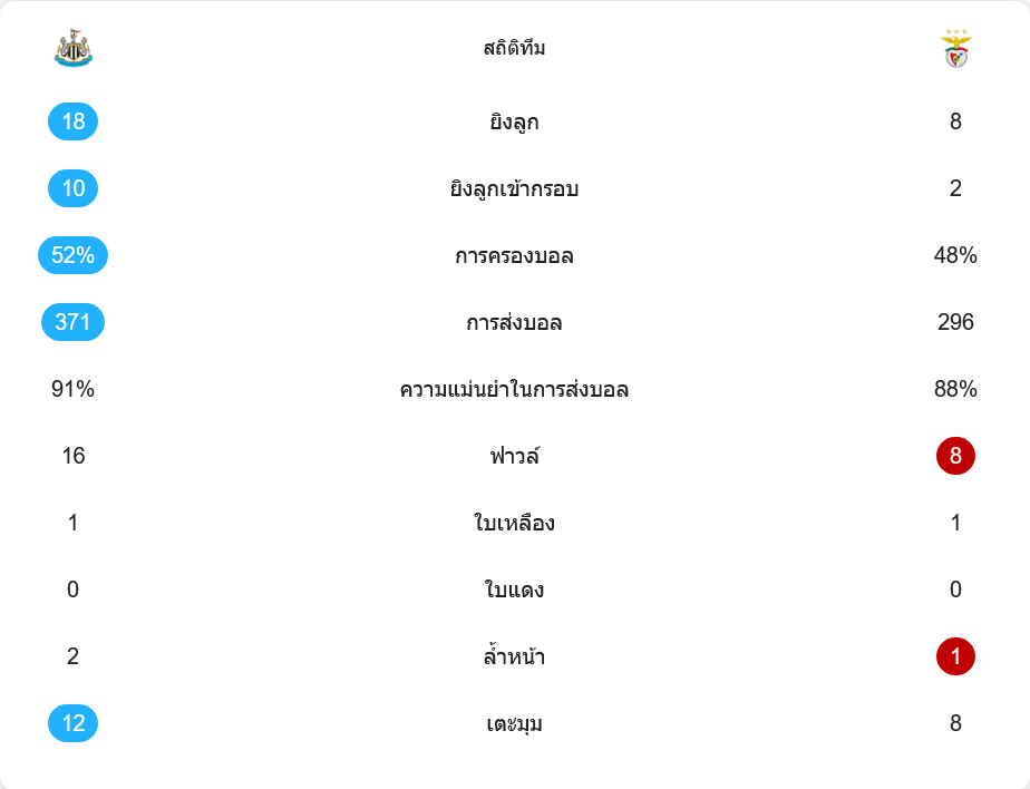 นิวคาสเซิ่ลครองบอล 52% ยิงทั้งหมด 18 ครั้ง เข้ากรอบ 10 ครั้ง ผ่านบอล 371 ครั้ง ความแม่นยำ 91% ขณะที่เบนฟิก้าครองบอล 48% ยิง 8 ครั้ง เข้ากรอบเพียง 2 ครั้ง ผ่านบอล 296 ครั้ง ความแม่นยำ 88% สะท้อนชัดว่าเจ้าถิ่นคมและจบสกอร์ได้เหนือกว่าอย่างมาก