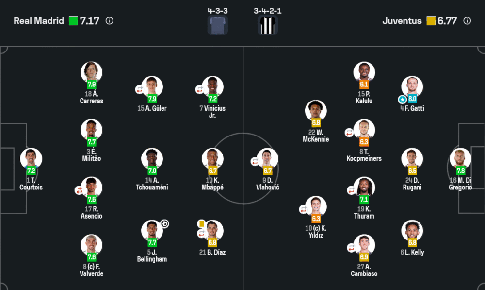 เฟเดริโก กัตติ (ยูเวนตุส) ได้คะแนนสูงสุด 8.0 แม้ทีมจะแพ้ แต่เจ้าตัวโชว์ฟอร์มเกมรับได้อย่างแข็งแกร่ง สกัดบอลสำคัญหลายครั้ง ปิดช่อง Mbappé ได้ดี ทำให้เกมนี้ไม่ใช่งานง่ายของแนวรุกมาดริด