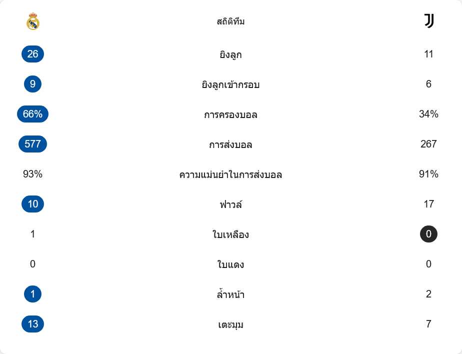 รูปเกมชัดเจนว่าเจ้าถิ่นเน้นครองบอลและใช้จังหวะต่อบอลเร็วเป็นหลัก มาดริดขึ้นเกมจากแดนกลางด้วยจังหวะของ วัลเวร์เด้ และ เบลลิงแฮม ที่คุมเกมอยู่หมัด การบุกเน้นเจาะริมเส้นและตัดเข้าใน ส่วนยูเวนตุสตั้งรับลึกและใช้การสวนกลับจาก วลาโฮวิช เป็นหลัก แต่ความแม่นยำในการเข้าทำยังไม่เฉียบพอจะแย่งแต้มกลับออกมาได้ ในแง่ วิเคราะห์บอล เกมนี้สะท้อนให้เห็นถึงความแตกต่างด้านความหลากหลายของเกมบุกที่ชัดเจน