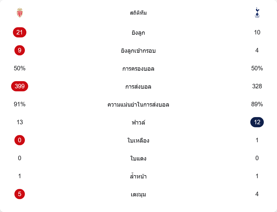 เกมนี้โมนาโกครองบอล 50% เท่ากับสเปอร์ส แต่มีจังหวะยิงถึง 21 ครั้ง เข้ากรอบ 9 ขณะที่ทีมเยือนยิงเพียง 10 ครั้ง เข้ากรอบ 4 การส่งบอลของโมนาโกมากถึง 399 ครั้ง ความแม่นยำ 91% เหนือกว่าสเปอร์สเล็กน้อยที่ 328 ครั้ง ความแม่นยำ 89% ฟาวล์ใกล้เคียงกันที่ 13 ต่อ 12 และเตะมุม 5 ต่อ 4 เป็นอีกเกมที่โมนาโกบุกมากแต่จบไม่คม ส่วนสเปอร์สเล่นแบบรัดกุม