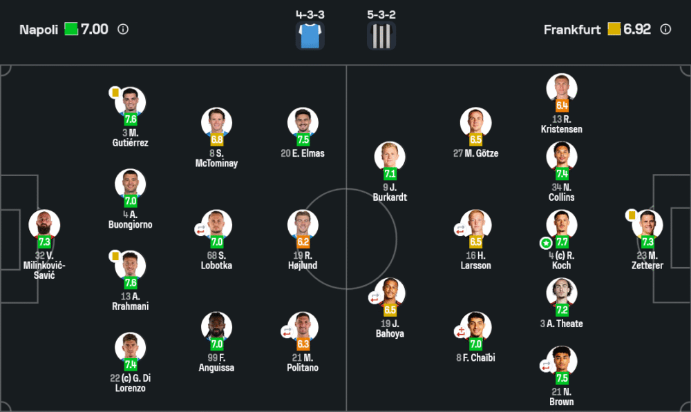 ท้ายเกม นาโปลีโหมบุกแบบ “ยกแผง” ทั้ง ดิ ลอเรนโซ่, กูตีเอร์เรซ เติมขึ้นมาโยนใส่กรอบเขตโทษไม่หยุด แต่แฟร้งค์เฟิร์ตใช้เกมรับลึกและการอ่านจังหวะโหม่งเคลียร์ของ ค็อค กับ เตียเต้ ช่วยกันสกัดได้ทุกลูก นาที 89 เซตเทอเรอร์โดนใบเหลืองข้อหาถ่วงเวลาเป็นสัญลักษณ์ว่าทีมเยือนพอใจแล้วกับหนึ่งคะแนน