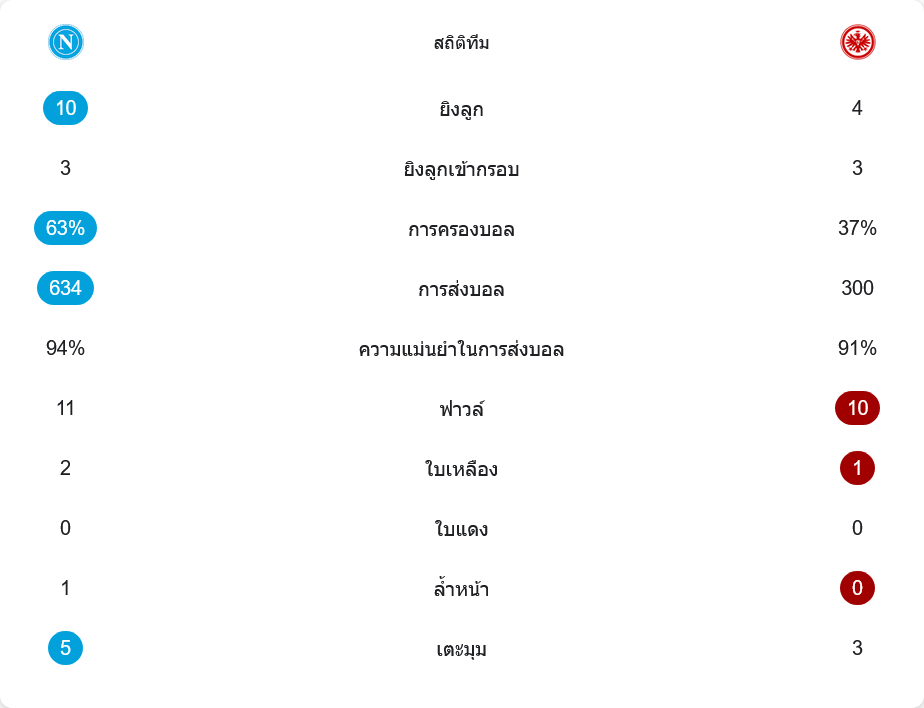 ตัวเลขหลังเกมย้ำชัดว่านี่คือแมตช์ที่นาโปลีทำได้ทุกอย่างยกเว้นยิงประตู เจ้าถิ่นครองบอลมากถึง 63% จากการส่งบอล 634 ครั้ง ความแม่นยำสูงลิ่ว 94% ขณะที่แฟร้งค์เฟิร์ตมีเพียง 300 ครั้ง ความแม่นยำก็ไม่ธรรมดาที่ 91%