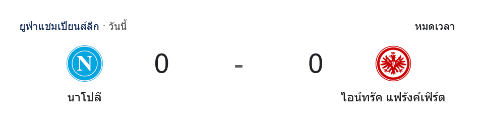 • ⏱️ FT – เป่านกหวีดจบเกม สกอร์ 0-0 นาโปลี 0–0 ไอน์ทรัค แฟร้งค์เฟิร์ต