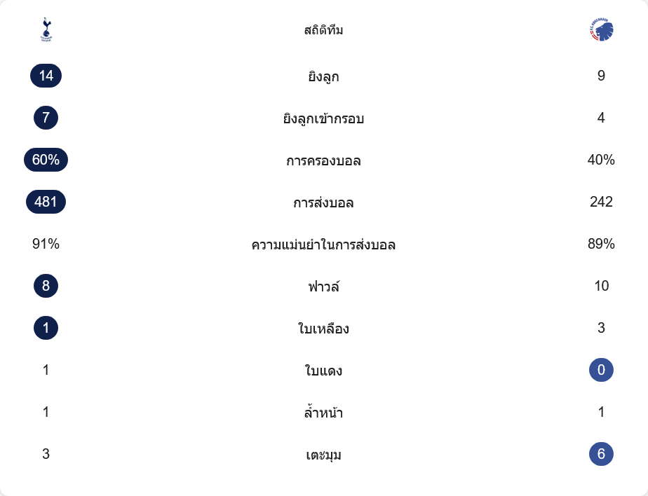 ตัวเลขหลังเกมสะท้อนทุกอย่าง สเปอร์สครองบอล 60% ต่อ 40% ชัดเจนว่าคุมจังหวะได้ดีกว่า สร้างโอกาสยิงรวมถึง 14 ครั้ง เข้ากรอบ 7 ขณะที่โคเปนเฮเก้นมีแค่ 9 ครั้ง เข้ากรอบ 4 เซฟของวิการิโอกับการบล็อกจากแนวรับม้าลาย เอ้ย ไก่เดือยทอง ทำให้ทีมเยือนไร้สกอร์