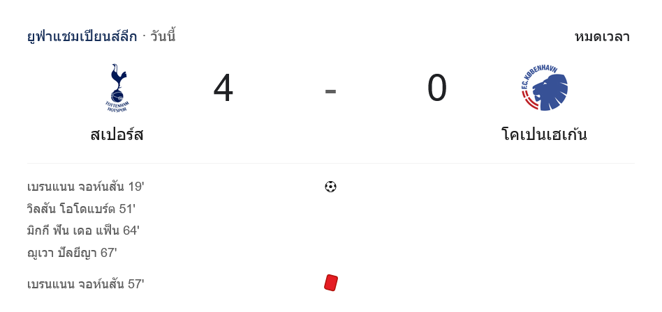 ค่ำคืนแห่งศึกยูฟ่าแชมเปียนส์ลีกที่ท็อตแน่ม ฮ็อทสเปอร์ สเตเดียม แฟนบอลที่กดเช็กหน้าเว็บ ผลบอลสด กันรัวๆ ต้องสะดุ้งเมื่อเห็นสกอร์ไหลไม่หยุด สเปอร์ส เปิดบ้านอัด เอฟซี โคเปนเฮเก้น ไปถึง 4-0 ทั้งๆ ที่ต้องเล่นแค่ 10 คน ตั้งแต่นาทีที่ 56 แต่ยังคุมเกมเอาอยู่ทุกจังหวะ