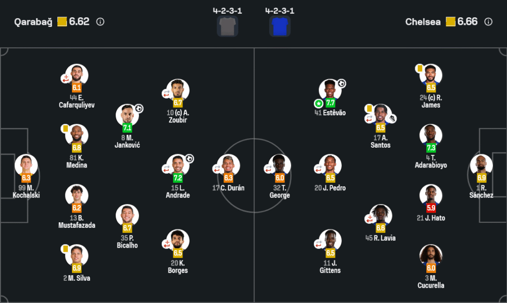 แม้ว่าผลออกมาเสมอ แต่รางวัล Man of the Match ตกเป็นของ เอสเตวาโอ ปีกดาวรุ่งของเชลซี ด้วยคะแนน 7.7 เจ้าหนูบราซิเลียนรายนี้คือคนที่เปิดสกอร์แรก ใช้ความเร็วและเทคนิคพาบอลเจาะแนวรับคาราบัคได้ตลอด แทบทุกครั้งที่เขาได้บอลฝั่งขวา กองหลังเจ้าถิ่นต้องดร็อปตัวช่วยกันสองคน ทำให้เพื่อนร่วมทีมมีพื้นที่เล่นมากขึ้น