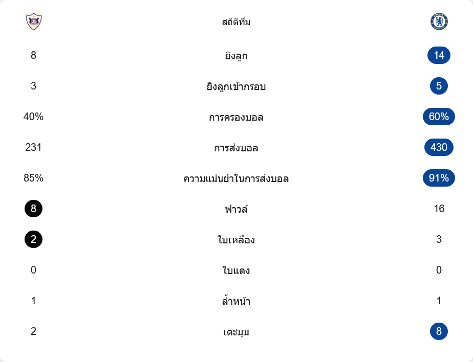 ตัวเลขหลังเกมสะท้อนชัดว่า เชลซีเหนือกว่าเล็กน้อยในหลายมิติ ทีมเยือนครองบอลถึงราว 60% ต่อ 40% ของคาราบัค ส่งบอลกว่า 430 ครั้งด้วยความแม่นยำสูงถึง 91% ขณะที่เจ้าบ้านส่งได้ 231 ครั้ง แม่นยำ 85% เท่านั้น โอกาสยิงรวม เชลซีทำได้ 14 ครั้ง เข้ากรอบ 5 ครั้ง ส่วนคาราบัคมีโอกาส 8 ครั้ง เข้ากรอบ 3 ครั้ง หมายความว่าจำนวนจบสกอร์ของเชลซีมากกว่า แต่ประสิทธิภาพในการเปลี่ยนโอกาสเป็นประตูกลับไม่หนีห่างกันมากนัก