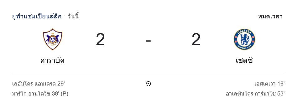 จาก : ผลบอลสด ยูฟ่าแชมเปียนส์ลีก ระหว่าง คาราบัค 2-2 เชลซี วันนี้ 6/11/68 – บ้านกีฬา
