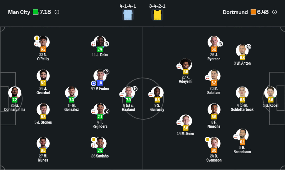 ชัดเจนที่สุดคือ ฟิล โฟเดน ที่ทั้งยิงทั้งปั่นเกมรุกจนแนวรับดอร์ทมุนด์เอาไม่อยู่ ส่วน ฮาแลนด์ ยังรักษามาตรฐานเพชฌฆาตหน้าปากประตู และ เรย์จ์นเดอร์ส ทำหน้าที่จอมทัพเชื่อมเกมกลาง–หน้าได้สุดเนียน