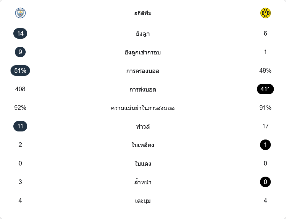 ตัวเลขจาก บ้านผลบอล และหน้าสถิติบ่งบอกชัด แมนฯ ซิตี้ยิงทั้งหมด 14 ครั้ง เข้ากรอบถึง 9 ครั้ง ส่วนดอร์ทมุนด์มีโอกาสเพียง 6 ครั้ง เข้ากรอบ 1 ครั้งเท่านั้น การครองบอลใกล้เคียงกัน 51% ต่อ 49% และจำนวนการจ่ายบอลก็สูสี 408 ต่อ 411 แสดงให้เห็นว่าเกมนี้ไม่ใช่การบุกข้างเดียว แต่เป็นเรื่องของความคมและการตัดสินใจในจังหวะสุดท้ายล้วน ๆ