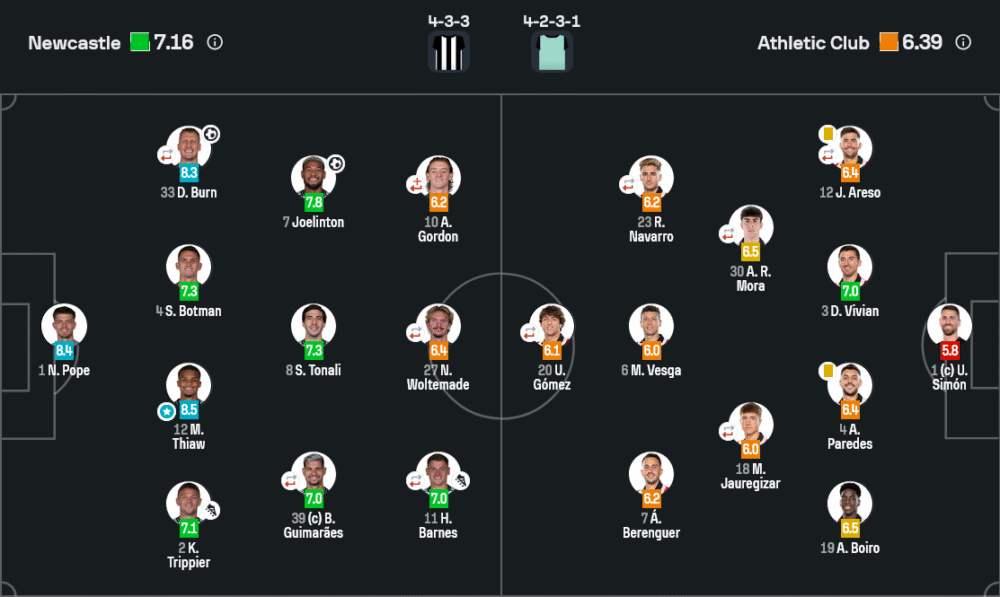 ตำแหน่งแข้งยอดเยี่ยมของเกมนี้ ไม่มีใครเหมาะสมไปกว่า มาลิค ธิอาว์ เซ็นเตอร์แบ็กตัวเก่งของนิวคาสเซิ่ล ที่ได้คะแนน 8.5 จาก Sofascore บ้านกีฬา เห็นด้วยเต็มสองตาเพราะตลอด 90 นาที เขาแทบไม่เสียท่าให้แนวรุกบิลเบาเลย ไม่ว่าจะเป็นลูกเปิดจากด้านข้างหรือบอลแทงทะลุช่อง ธิอาว์อ่านทางบอลได้เยี่ยม ยืนดักบอลก่อนถึงตัว เบเรนเกร์ หลายครั้ง รวมทั้งเก็บลูกกลางอากาศจากเตะมุม–ฟรีคิกได้แทบหมด