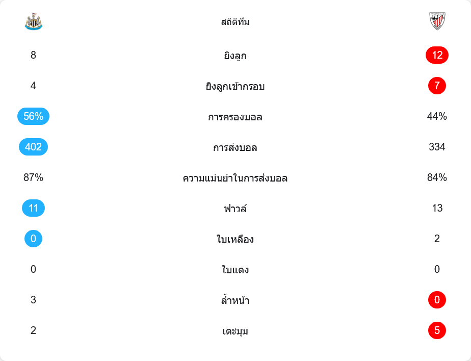 ตัวเลขหลังเกมบอกชัดว่า นี่ไม่ใช่เกมที่บิลเบาโดนบุกฝ่ายเดียว ทีมเยือนยิงทั้งหมด 12 ครั้ง เข้ากรอบ 7 ครั้ง ขณะที่นิวคาสเซิ่ลยิงเพียง 8 ครั้ง เข้ากรอบ 4 ครั้ง แต่เจ้าบ้านเปลี่ยนสองจากสี่ครั้งนั้นให้กลายเป็นประตูได้สำเร็จ การครองบอล นิวคาสเซิ่ลถือบอลมากกว่าเล็กน้อยที่ 56% ต่อ 44% ส่งบอลสำเร็จ 402 ต่อ 334 ครั้ง ความแม่นยำใกล้เคียงกัน 87% ต่อ 84%
