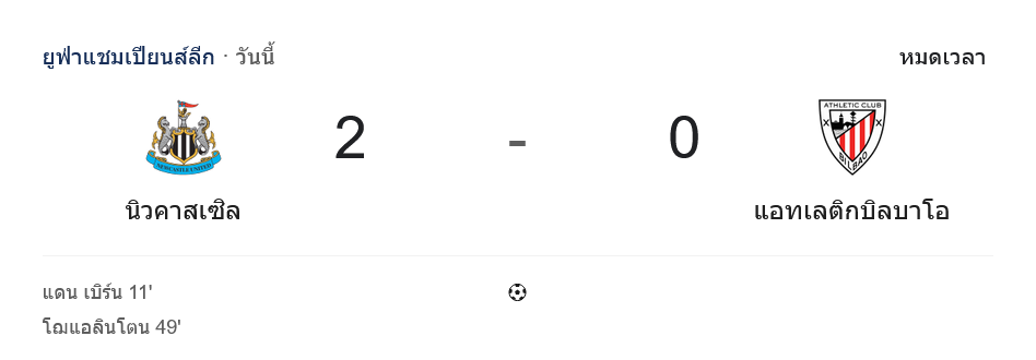 - ⏰ 90+5′ จบเกมที่เซนต์ เจมส์ พาร์ก นิวคาสเซิ่ล ยูไนเต็ด เปิดบ้านชนะ แอธเลติก บิลเบา 2-0