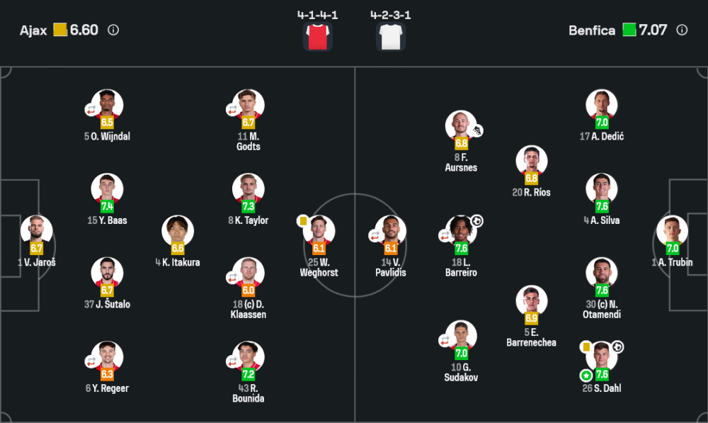 เบนฟิก้าในทางกลับกันยืน 4-2-3-1 แบบเน้นระเบียบแท็คติกกว่าแสดงให้เห็นในเชิง วิเคราะห์บอล ว่าพวกเขาวางแผนมาเพื่อรับมือการต่อบอลของอาแจกซ์โดยเฉพาะ คู่มิดฟิลด์ตัวรับ บาเรเนเชีย–บาร์เรย์โร่ ยืนซ้อนกันไม่ห่าง ปิดช่องว่างระหว่างเส้น ทำให้บอลเจาะตรงกลางแทบไม่ผ่าน เมื่ออาแจกซ์ดันฟูลแบ็กสูง ทั้งดาห์ลและเดดิชจึงมีพื้นที่สวนกลับริมเส้น และนี่คือที่มาของประตูทั้งสองลูก – ลูกแรกมาจากการเติมของดาห์ล ลูกสองเกิดจากการสวนกลับที่ใช้จำนวนผู้เล่นให้ได้เปรียบในพื้นที่สุดท้าย
