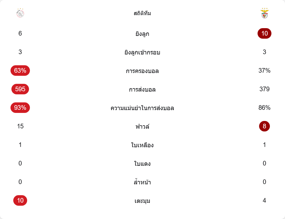 เบนฟิก้าแม้มีโอกาสยิงเพียง 10 ครั้ง เข้ากรอบ 3 เช่นกัน แต่สองในนั้นเปลี่ยนเป็นประตู ทั้งที่จำนวนการจ่ายบอลแค่ 379 ครั้ง ความแม่นยำ 86% น้อยกว่าชัดเจน ทว่าความคมและการตัดสินใจในพื้นที่สุดท้ายสร้างความต่าง ฟาวล์ของอาแจกซ์มากถึง 15 ครั้ง สะท้อนว่าต้องหยุดเกมสวนกลับของทีมเยือนบ่อย ขณะที่เบนฟิก้าทำฟาวล์แค่ 8 ครั้ง ใบเหลืองฝั่งละ 1 แต่จังหวะอันตรายจริง ๆ เป็นของทีมเยือนที่ใช้โอกาสไม่เปลือง นอกจากนี้อาแจกซ์ได้เตะมุมถึง 10 ครั้ง เทียบกับเบนฟิก้า 4 แต่ก็ไม่สามารถเปลี่ยนเป็นสกอร์ได้เลย