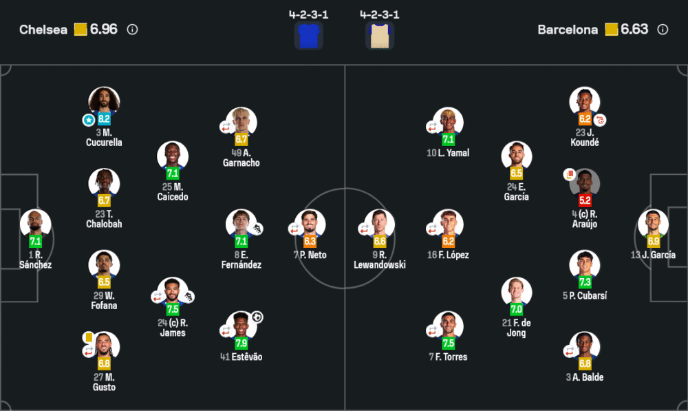 รองลงมาคือ เอสเตวาโอ้ (7.9) ที่ยิง 1 ประตูและดึงเกมรับคู่แข่งแตกกระจาย รวมถึง เลียม เดลาป (7.5) ที่ลงมาปิดจ็อบ ส่วนฝั่งบาร์ซ่าที่โดดเด่นสุดคือ เปา คูบาร์ซี กับ เฟร์ราน ตอร์เรส แต่ก็ไม่พอจะช่วยทีมรอดพ้นจากความพ่ายแพ้เละเทะครั้งนี้