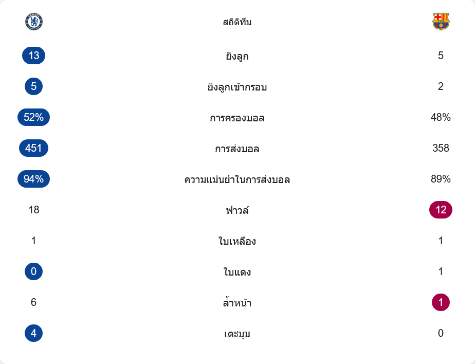 แม้ตัวเลขการครองบอลจะใกล้เคียงกัน เชลซี 52% ต่อ บาร์เซโลน่า 48% แต่เชิงคุณภาพต้องบอกว่าบ้านคือฝ่ายกำหนดจังหวะทั้งหมด เจ้าถิ่นยิงรวม 13 ครั้ง เข้ากรอบ 5 ครั้ง เปลี่ยนเป็น 3 ประตูเต็ม ๆ ขณะที่บาร์ซ่ายิงได้เพียง 5 ครั้ง เข้ากรอบแค่ 2