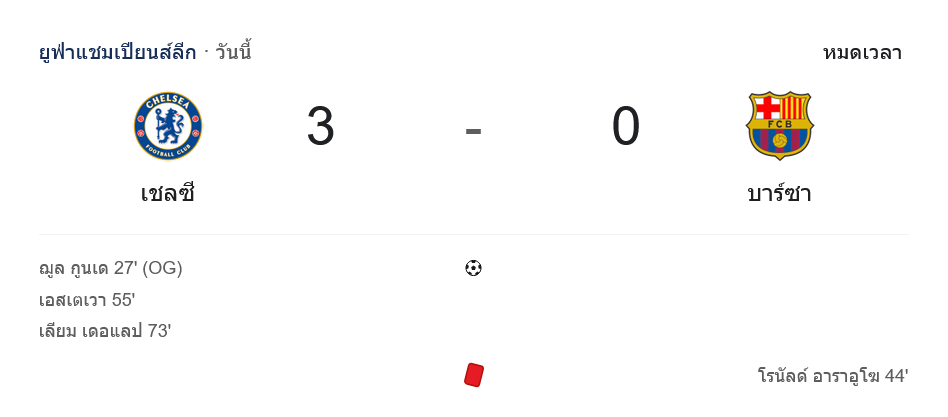 ท้ายเกม มาเรสก้าส่งสำรองลงมาเก็บเวลา ทั้ง เจมี่ กิทเทนส์, จอช อาชีอัมปง และ ไทริก จอร์จ ขณะที่ฝั่งบาร์ซ่าก็ส่ง ดานี่ โอลโม่ กับ เคราร์ด มาร์ติน ลงมาลองของ แต่ก็ทำอะไรไม่ได้มากแล้ว จบ 90 นาที เชลซีถล่มบาร์ซ่า 3-0 แบบเหนือชั้น ทั้งสกอร์และทรงบอล ตรงกับที่แฟน ๆ เปิดหน้าเว็บ บ้านผลบอล แล้วต้องขยี้ตาดูซ้ำว่าใช่จริงหรือเปล่า