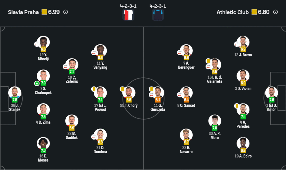 🇨🇿 สลาเวีย ปราก (4-2-3-1) – เรตติ้งเฉลี่ย 6.99