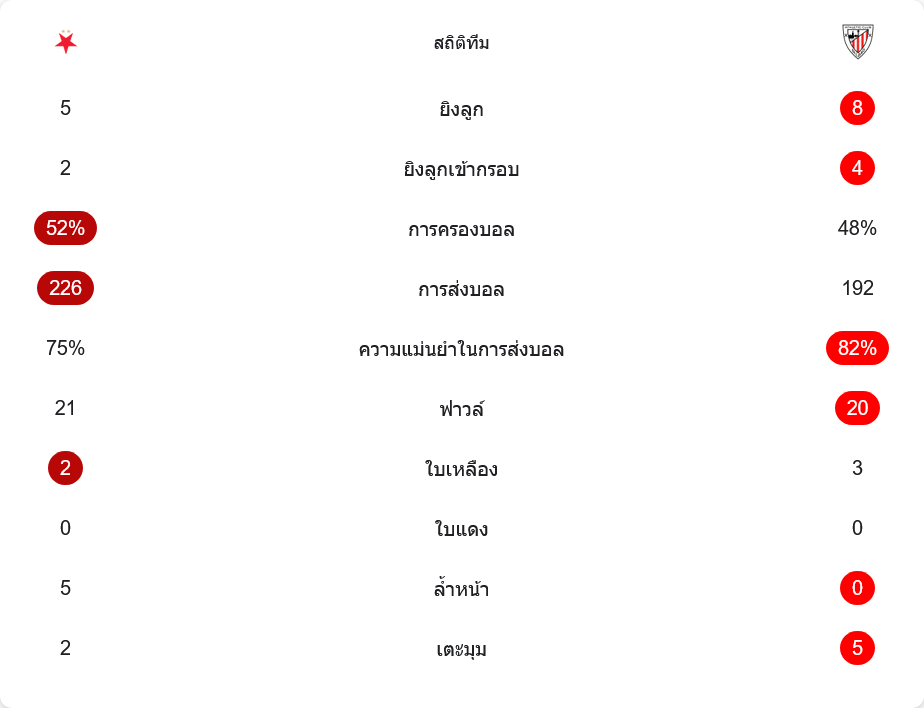 ตัวเลขหลังเกมสะท้อนความสูสีแต่แฝงรายละเอียดน่าสนใจ สลาเวีย ปราก ครองบอล 52% ต่อ 48% สร้างโอกาสยิงได้ 5 ครั้ง เข้ากรอบ 2 ครั้ง ขณะที่ แอธเลติก บิลเบา ยิงมากกว่า 8 ครั้ง เข้ากรอบ 4 ครั้ง แสดงให้เห็นว่าทีมเยือนมีโอกาสจบสกอร์ชัดเจนกว่าเล็กน้อย