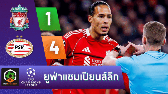 ยูฟ่าแชมเปียนส์ลีก ค่ำคืนที่แอนฟิลด์กลายเป็นฝันร้ายของสาวกหงส์แดง เมื่อ ลิเวอร์พูล โดน พีเอสวี ไอนด์โฮเฟ่น บุกมายิงยับ 1-4 ทั้งที่รูปเกมและตัวเลขบนจอ ผลบอลสด แสดงชัดว่าเจ้าถิ่นเหนือกว่าทั้งการครองบอลและโอกาสยิง แต่คมไม่พอ ขณะที่ทีมเยือนจากฮอลแลนด์เล่นเนียน ใช้โอกาสไม่กี่ครั้งเปลี่ยนเป็นสกอร์แบบโหดเหี้ยม บ้านกีฬา มองว่านี่คือเกมที่แสดงให้เห็นถึงความเปราะบางเวลา ลิเวอร์พูล ต้องรับมือเกมสวนกลับเร็วระดับเวทียุโรป