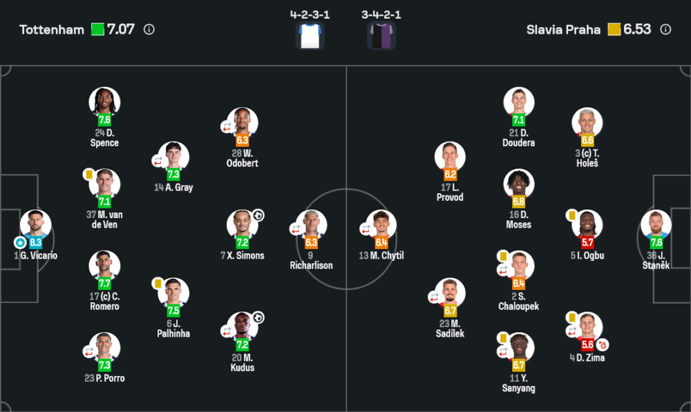 รูปเกมคืนนี้สะท้อนชัดว่าสเปอร์สของโธมัส แฟรงค์เตรียมแผนมาอย่างดี แท็กติก 4-2-3-1 เน้นครองบอลจากแนวรับขึ้นมาทีละจังหวะ อาศัยจังหวะเปลี่ยนแกนเร็วจาก ปาลินญ่า และ วิเคราะห์บอล กันมาชัดเจนว่าแนวรับสามคนของสลาเวียไม่ถนัดการดันไลน์สูง ทำให้ไก่เดือยทองเน้นแทงช่องหลังไลน์โดยใช้ความคล่องของคูดุสกับซีมอนส์