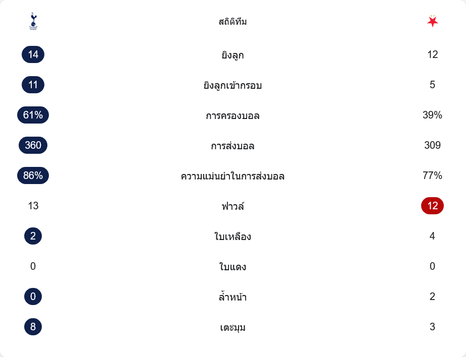 ภาพรวมตัวเลขหลังเกมสะท้อนความเหนือกว่าของสเปอร์สอย่างชัดเจน เจ้าถิ่นยิงทั้งหมด 14 ครั้ง เข้ากรอบถึง 11 ขณะที่สลาเวียได้ลองส่อง 12 ครั้ง เข้ากรอบเพียง 5 เมื่อบวกกับการครองบอล 61% ต่อ 39% ทำให้เห็นว่าบอลส่วนใหญ่หมุนอยู่กับไก่เดือยทอง การต่อบอลของสเปอร์สแม่นยำถึง 86% จากการจ่าย 360 ครั้ง ส่วนทีมเยือนจ่ายบอล 309 ครั้ง ด้วยความแม่นยำ 77% ตัวเลขใบเหลือง 2 ต่อ 4 และฟาวล์ 13 ต่อ 12 ตอกย้ำว่าทีมจากเช็กต้องเหนื่อยไล่ตัดเกมบ่อยครั้ง ขณะที่ลูกเตะมุมสเปอร์สได้ถึง 8 ครั้ง เทียบกับสลาเวีย 3 ครั้ง แสดงให้เห็นว่ากดดันแนวรับคู่แข่งแทบทั้งเกม