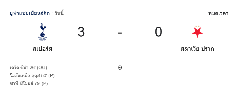 สายเช็กสกอร์สดไม่ว่าจะเชียร์สเปอร์ส หรือจับตาฟอร์มของทีมจากเช็กอย่างสลาเวีย ถ้าอยากตามทุกจังหวะของศึกยุโรปแบบไม่พลาดช็อตสำคัญ แวะเข้ามาดู บ้านผลบอล คู่เด็ด, สถิติหลังเกมละเอียด และอัปเดตข่าวฟุตบอลรอบโลกได้ตลอดทั้งวันกับ “บ้านกีฬา” ที่เดียวครบจบทั้งสกอร์และเรื่องราวรอบสนาม