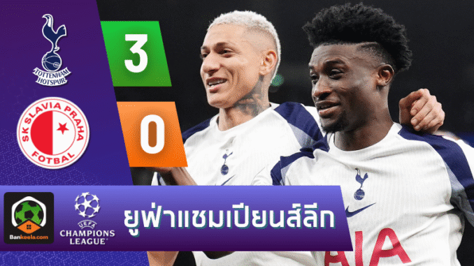 ค่ำคืนนี้แฟนบอลที่เช็กสกอร์ผ่าน บ้านผลบอล และลุ้น ผลบอลสด กันแบบตาไม่กะพริบ คงยิ้มแก้มปริเมื่อเห็นสกอร์ที่ท็อตแน่ม ฮ็อทสเปอร์ เปิดเล้าไก่ปราบ สลาเวีย ปราก ไปแบบไม่ไว้หน้า 3-0 ศึกยูฟ่าแชมเปียนส์ลีก นัดที่ 6 ของรอบลีกใหม่ ผลงานนี้ไม่ใช่แค่สามแต้มธรรมดา แต่คือการประกาศศักดาว่าไก่เดือยทองพร้อมกลับมาเป็นของแข็งในยุโรปอย่างเต็มตัว