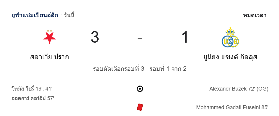 การแข่งขัน ฟุตบอลยูฟ่าแชมเปียนส์ลีก 2024 ระหว่างทีม สลาเวีย ปราก กับ แซงต์ กิลลุส จบลงด้วยชัยชนะของทีมสลาเวีย ปรากด้วยสกอร์ 3-1 ในเกมที่เต็มไปด้วยความตื่นเต้นและการเล่นที่น่าประทับใจจากทั้งสองทีม