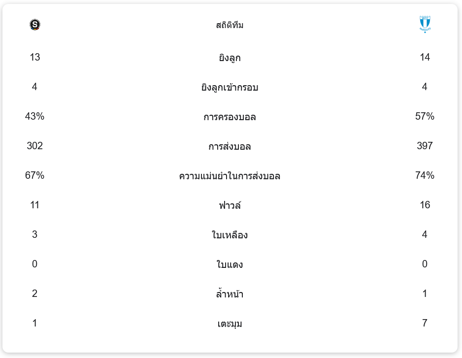 ในเกมนี้ สปาร์ตา ปรากมีการยิงทั้งหมด 13 ครั้ง โดยเข้ากรอบ 4 ครั้ง แม้จะมีเปอร์เซ็นต์การครองบอลที่ต่ำกว่าอยู่ที่ 43% แต่การส่งบอลสำเร็จของพวกเขาอยู่ที่ 302 ครั้ง ด้วยความแม่นยำ 67% ขณะที่ มัลโม่ เอฟเอฟ ทำได้ดีกว่าในการครองบอลที่ 57% และมีการส่งบอลสำเร็จสูงถึง 397 ครั้ง และความแม่นยำในการส่งบอลอยู่ที่ 74% มัลโม่ เอฟเอฟ ยิงทั้งหมด 14 ครั้ง เข้ากรอบ 4 ครั้งเช่นกัน แสดงถึงความพยายามในการหาทางเจาะเกมรับของสปาร์ตา ปราก
