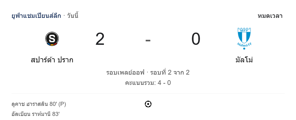 สปาร์ตา ปราก เฉือนชนะ มัลโม่ เอฟเอฟ 2-0 ทะลุรอบต่อไปในศึกยูฟ่าแชมเปียนส์ลีก