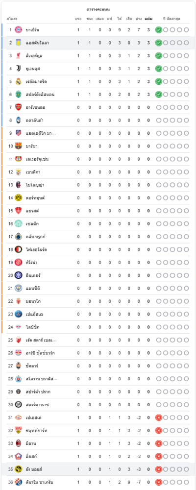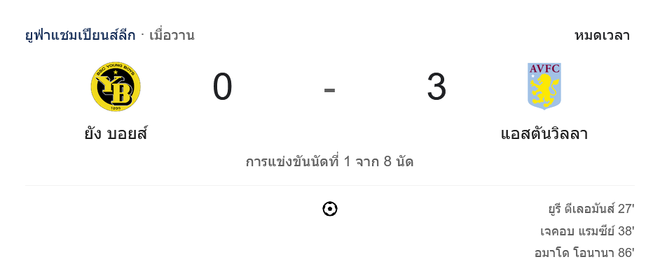 ตารางคะแนนยูฟ่าแชมเปียนส์ลีก 2024 ระหว่าง ยัง บอยส์ 0-3 แอสตัน วิลล่า