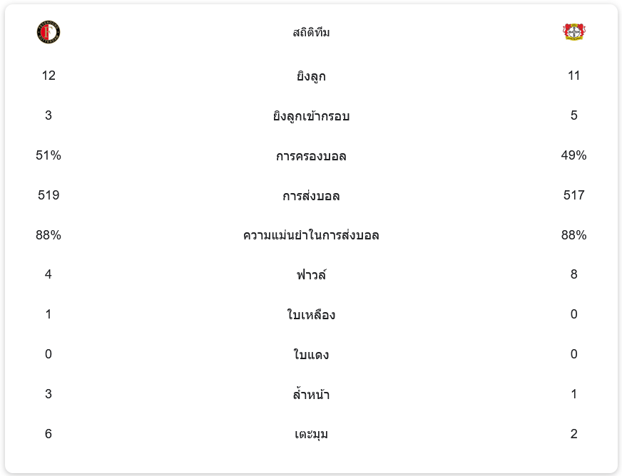 เกมนี้เฟเยนูร์ดมีโอกาสยิงทั้งหมด 12 ครั้ง โดยเข้ากรอบเพียง 3 ครั้ง ขณะที่เลเวอร์คูเซินมีโอกาสยิง 11 ครั้งและยิงเข้ากรอบ 5 ครั้ง การครองบอลของทั้งสองทีมค่อนข้างสูสีกัน โดยเฟเยนูร์ดครองบอลได้ 51% ขณะที่เลเวอร์คูเซินครองบอลได้ 49% ความแม่นยำในการส่งบอลของทั้งสองทีมอยู่ที่ 88% เท่ากัน แต่เลเวอร์คูเซินทำได้ดีกว่าในการสร้างสรรค์โอกาสและจบสกอร์
